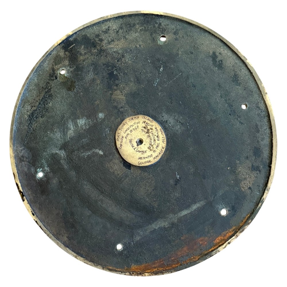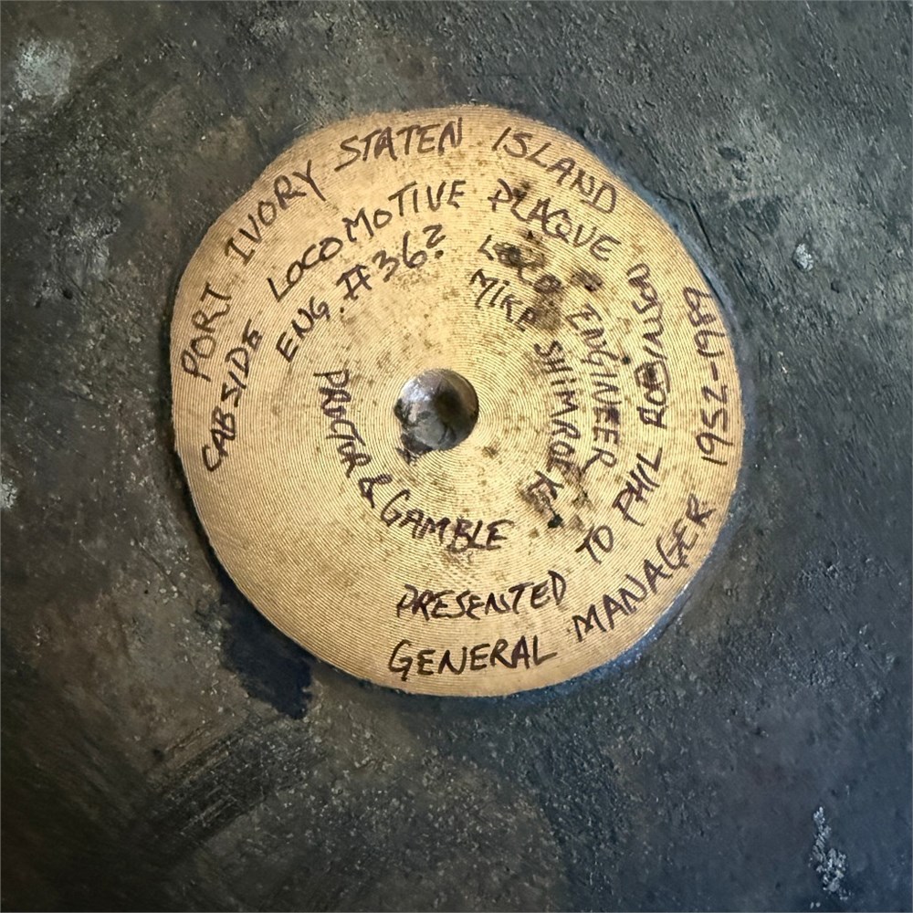 Proctor and Gamble Company.  Decorative brass locomotive plate from their company owned S4 diesel locomotive, engine #36.  This locomotive worked at the Port Ivory Staten Island New York.  Proctor and Gamble had two diesel locomotives with these brass emblems on the cab side.  The other locomotive was a Baldwin VO-660, engine #125.