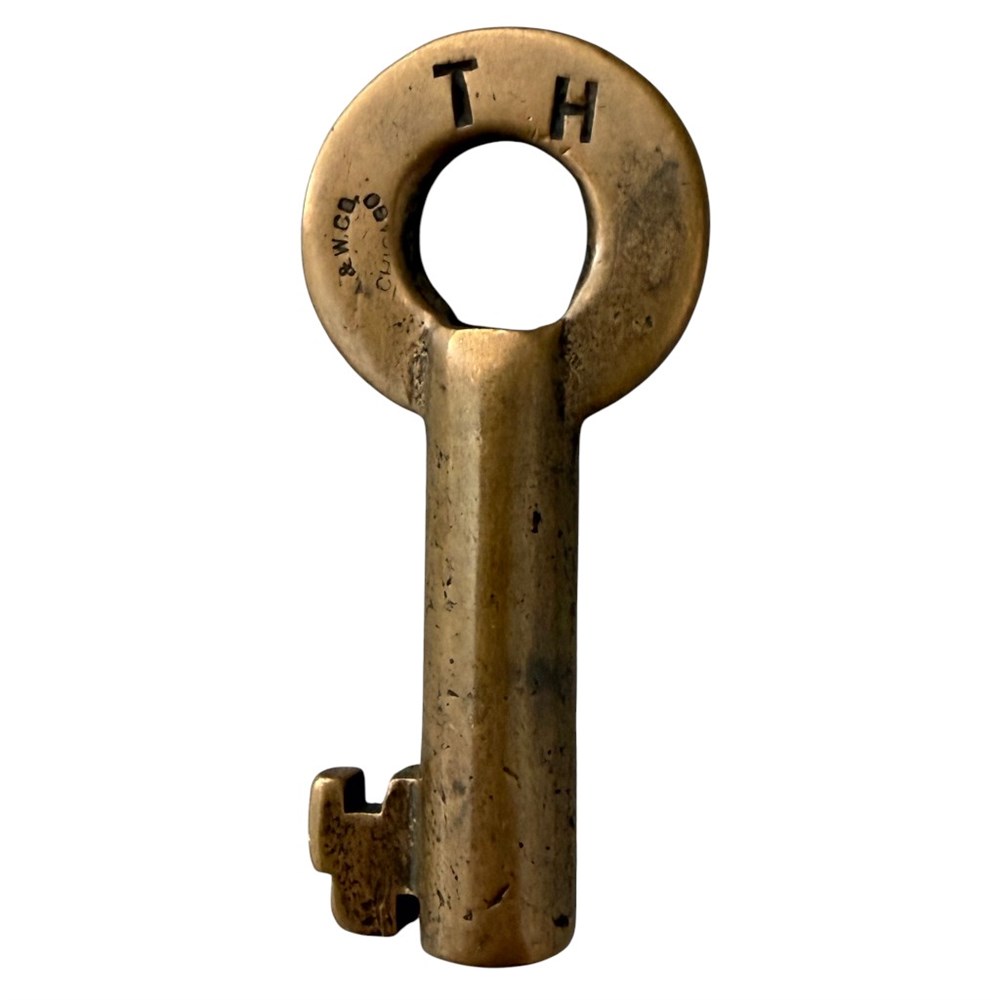 Santa Fe Railroad. Tool House key. Marked TH on the rear. Hallmarked with the Adams and Westlake football logo.