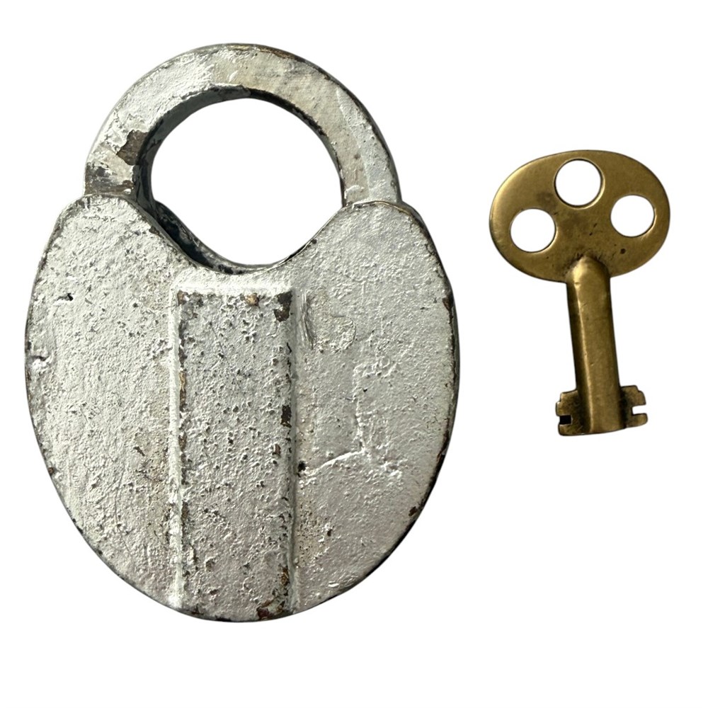 Chicago Burlington and Quincy Railroad.  Signal lock with unmarked key.  Smaller style lock.  Key works the lock perfectly.  Full spring movement in shackle and dust cover.  Lock still has the original silver paint from in service.  We believe this is the correct railroad issued key even though it is unmarked based on the other locks that have surfaced and sold in the past.