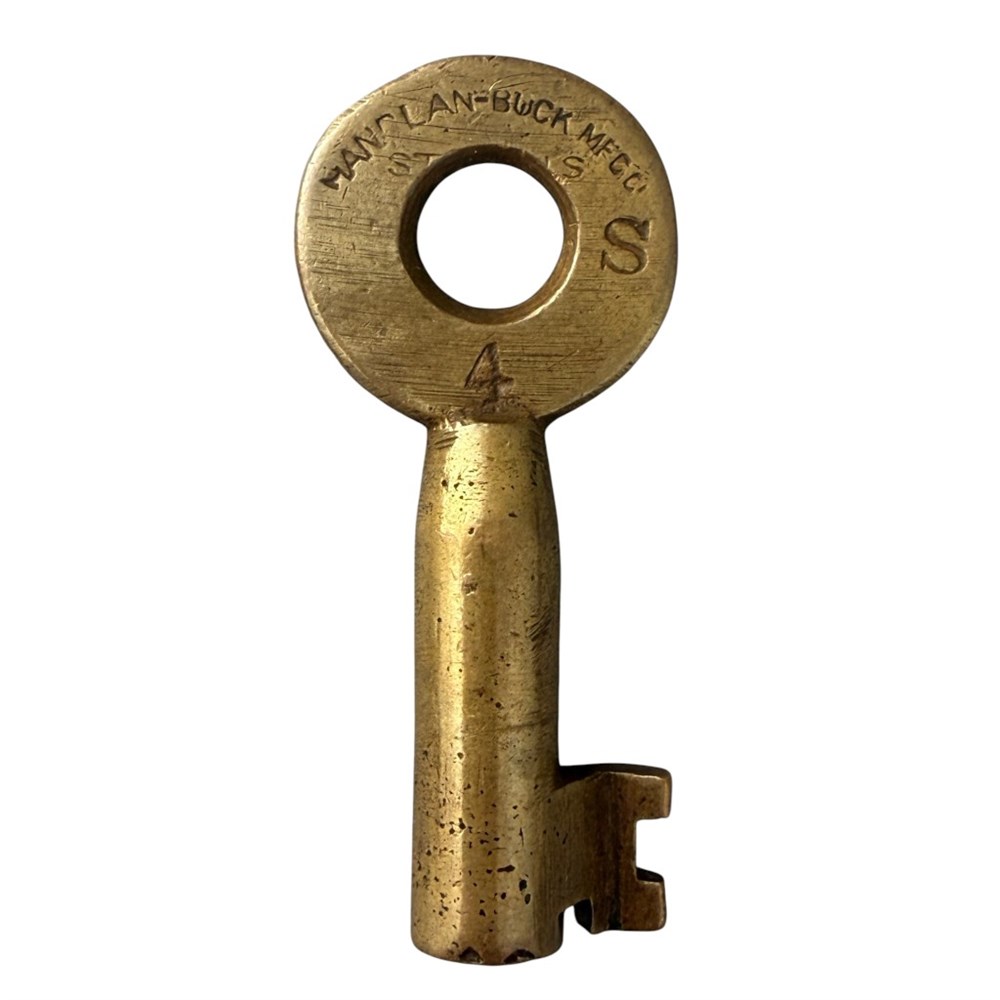 Uintah Railway.  Switch lock and key set.  The lock is hallmarked Handlan Buck.  The key is hallmarked Handlan Buck.  The lock functions but there are a couple items to note.  There is no longer any spring in the dust cover.  The key opens the lock but the shackle does not spring open.  Some light pressure from  a finger needs to applied as the key is turned to open the lock.  Beautiful untouched patina on both the lock and key.  An amazing lock set from a very popular Colorado narrow gauge railroad.  There is not a lot of marked Uintah Railway hardware out there so this is a special set.