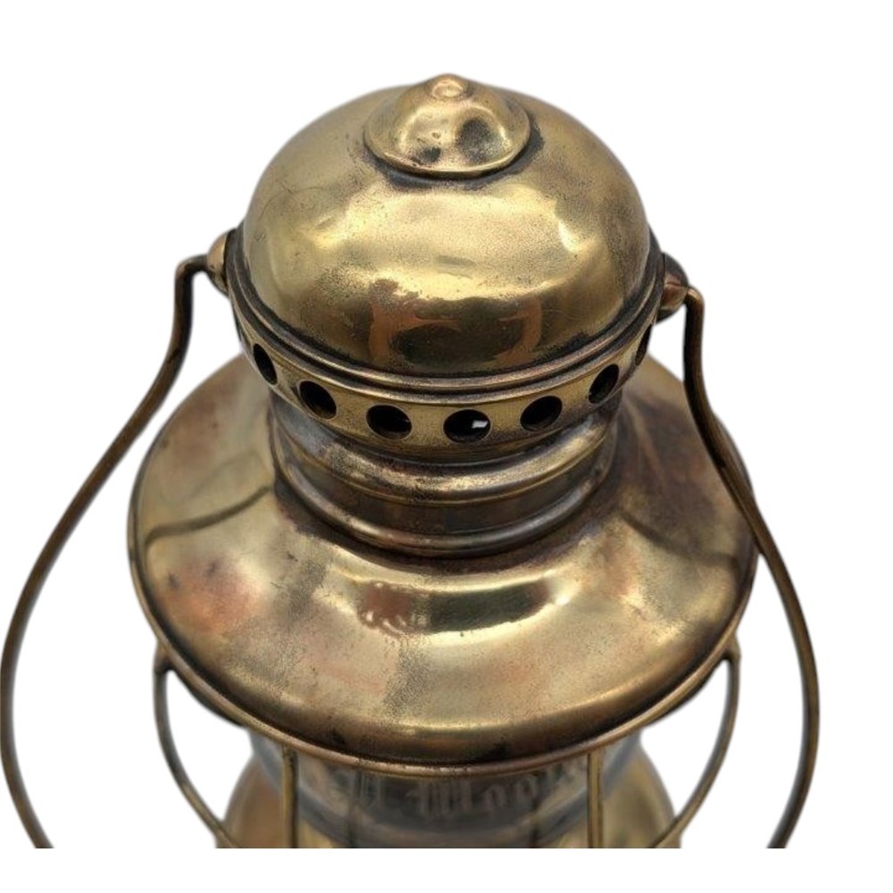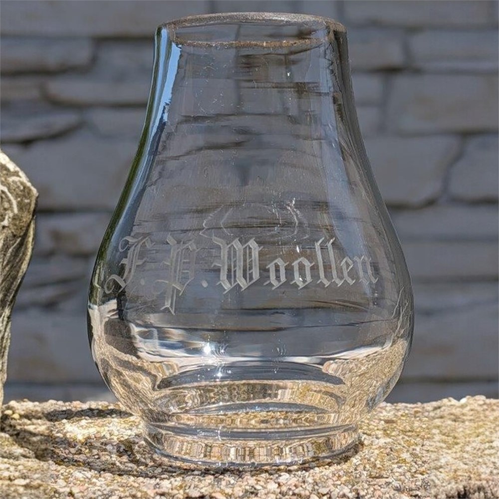 Conductors Lantern.  Manufactured by Adams and Westlake with 1868 dates.  This is the first/earliest style of lantern that has a slightly undersized globe and used a different type of "clip in" type fount which was later replaced with the more commonly seen screw in type.  The earlier style had a tendency to fall out the bottom.  This lantern had a shop repair to hold the fount in place so it is no longer removable.  Fount appears to have remnants of old gold paint.  Globe is beautiful and the harder to find smaller size.  Clear wheel cut marked F.P. Woollen.  The globe fits in the frame perfectly.