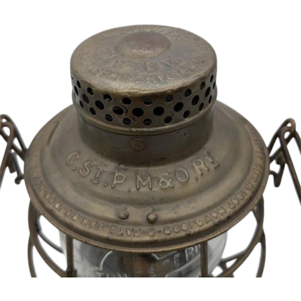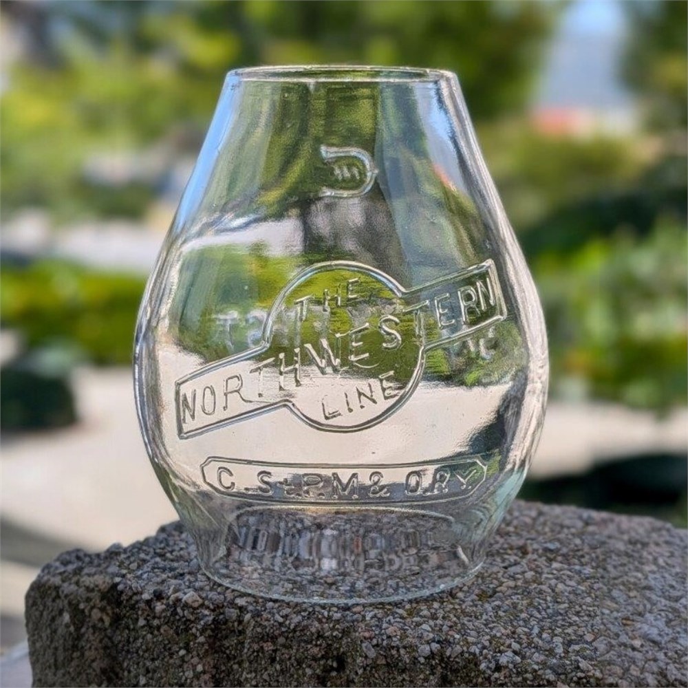 Chicago Milwaukee St. Paul and Omaha Railway.  Adlake Reliable model 1913.  Marked on the lid CSTPM&ORY.  Lantern frame is nice with traces of old clear coat.  Under the clear coat appears to be nice tin and the lantern shows lots of tin underneath the lid.  The globe is a clear cast CNX style with a very nice strike.  Embossed/cast with the famous Northwestern Line logo.  A beautiful logo globe.