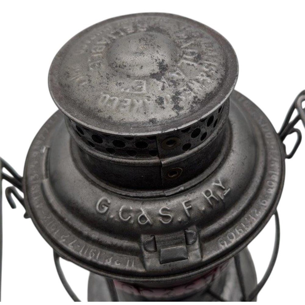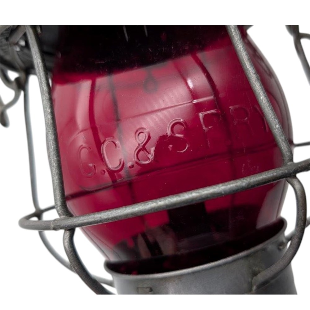 Gulf Colorado and Santa Fe Railway.  Adlake manufactured Reliable brakeman's lantern.  Model 1913 patent dates.  Lantern is embossed on the lid GC&SFRY.  The lantern frame is smooth to the touch with most likely an old cleaning at one time.  There is one small pinhole along the bottom of the bell.  Correct fuel fount and hallmarked on the end of the burner with dates.  The retainer is correct but might have been replaced at one time.  This is the more desirable should marked version of the frame.  The globe is a rare red cast CNX style globe cast/embossed GC&SFRY.  A very hard globe to find in red.  There is some light wind burn marks along the surface of the globe that could benefit from being cleaned up.  Top and bottom rims are very nice.  A clear in a lid marked frame recently sold for $1,100.