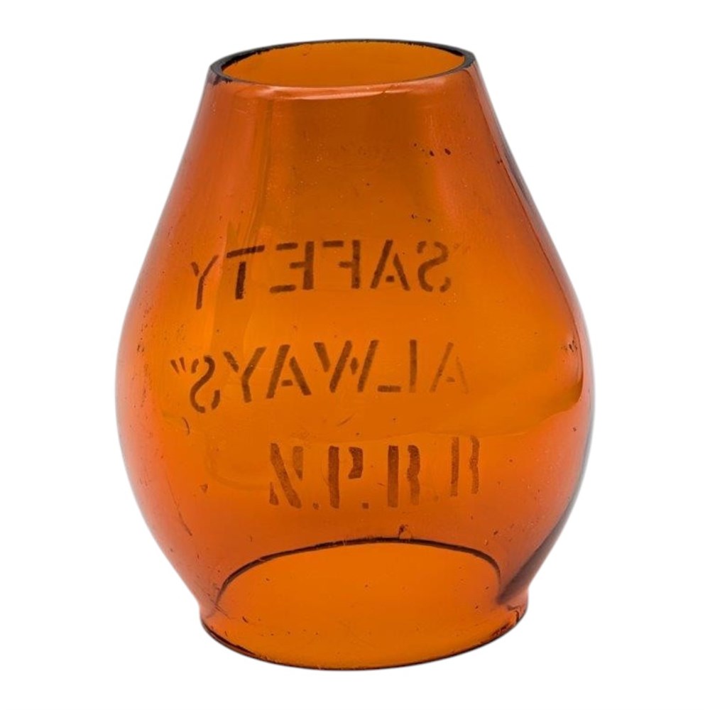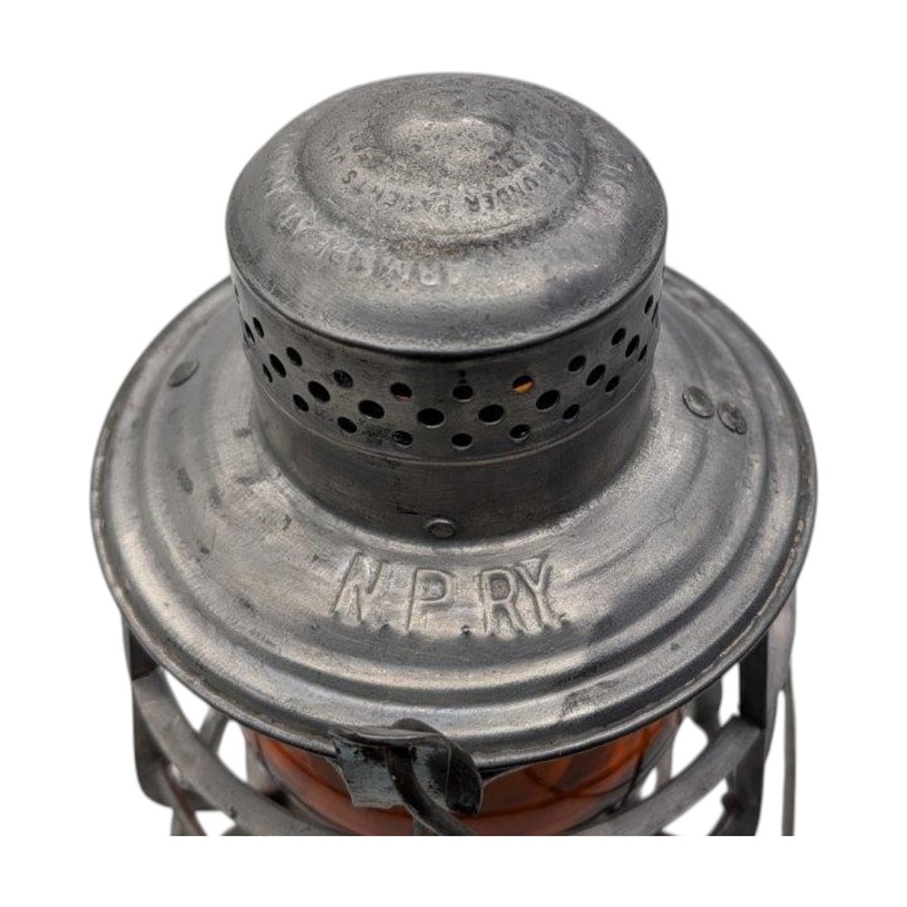 Northern Pacific Railway.  Armspear manufactured brakeman's lantern.  Model 1913 style frame.  Lantern frame is embossed on the lid NPRY.  The frame is almost fully tinned and is in gorgeous condition.  Original bail. lid latch, globe retainer, and the correct twist off fount dated 1910 on the brass strap.  Brass adjuster is marked Armspear.  The globe is a beautiful amber etched NPRR with Safety Always on the back.  The globe is hallmarked Corning.